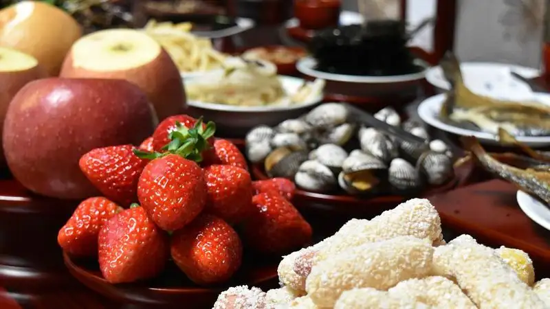 Снизить калорийность традиционных салатов можно, заменяя майонез на соус, приготовленный самостоятельно из нежирного йогурта с добавлением любимых специй. Пища на праздничном столе также не должна быть тяжелой. Лучше всего, если это будут рыбные блюда и морепродукты. Приготовьте больше легких закусок из свежих овощей, зелени и фруктов, заправленных соком лимона или граната, натуральным йогуртом.