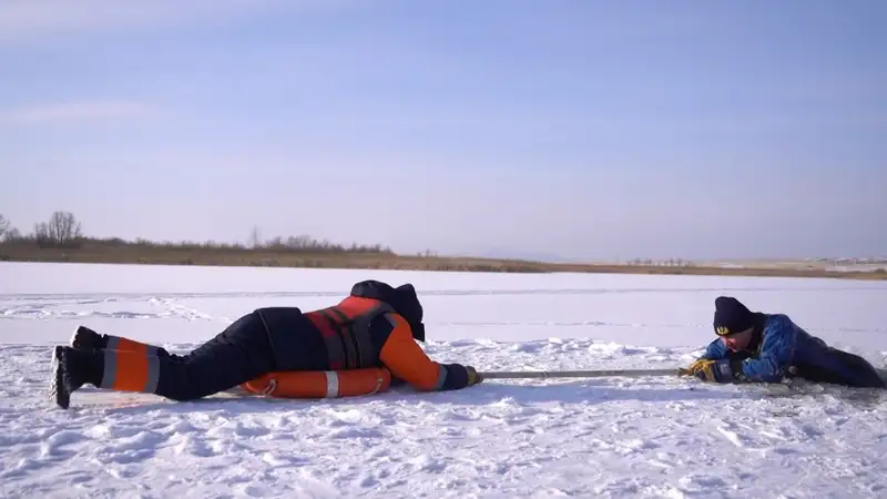 Согласно пункта 48 приказа №34 МВД РК "Правил безопасности на водоемах", при выходе на лед толщиной менее 25 см необходимо иметь с собой свисток, спасательный жилет, спасательные шильца, веревку диаметром не менее 11 мм длиной не менее 12 м, палку длиной не менее 2 м, мобильный телефон в водонепроницаемом пакете.