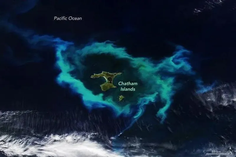 На недавнем спутниковом снимке запечатлено сверкающее пятно из фитопланктона, окружающее отдаленные острова Чатем (Новая Зеландия). Это зрелище – результат деятельности скрытой подводной структуры, которая способствовала гибели сотен китообразных, сообщает Zakon.kz.