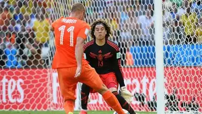 20. Форвард Нидерландов Арьен Роббен (слева) против голкипера Мексики Гильермо Очоа. (AFP Photo / Emmanuel Dunand)