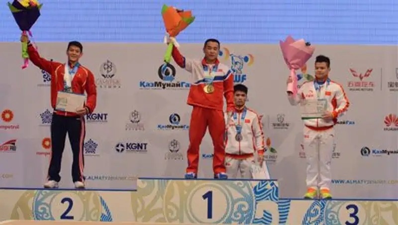 Первым победителем алматинского чемпионата мира по тяжелой атлетике стал Олимпийский чемпион Лондона Ом Юн Чоль из КНДР. В сумме по двум упражнениям он набрал 296 кг(128 кг,168 кг).