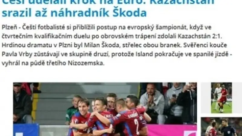 «Сборная Чехии по футболу пережила трудные моменты в этот вечер, но в итоге смогла спастись от позора», — пишет футбольный портал Fotbal.idnes.cz. «В квалификационном матче ЕВРО-2016 подопечные Павла Врба долгое время уступали со счетом 0:1 аутсайдеру группы А Казахстану, но все же смогли отыграть и выйти вперед. Героем встречи стал Милан Шкода, оформивший дубль.