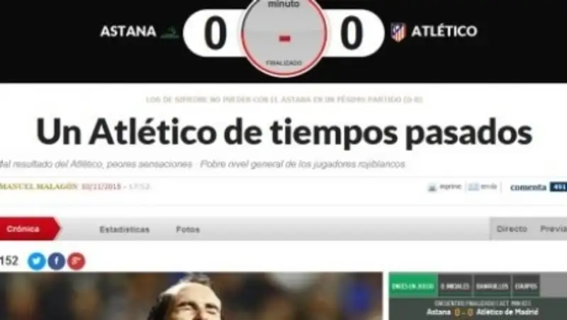 «Разочарование от игры „Атлетико“ в Лиге Чемпионов продолжается. Попав в одну из самых легких групп турнира, „матрасники“ не то, что не смогли еще гарантировать себе первое место в ней, а даже в состоянии не попасть еще в 1/8 финала. Очередной конфуз подопечные Диего Симеоне потерпели в Казахстане, где не смогли победить дебютанта турнира „Астану“», — пишет автор престижного не только в Испании, но и во всем мире спортивного издания «Marca» Ману Малагон. «Футболисты „Атлетико“ играли слишком мягко и без желания, словно три очка им и не нужны вовсе, так как выход из группы и первое в ней место уже у них в кармане. По игре тренерский штаб „матрасников“ вряд ли может предъявить претензии разве что голкиперу Облаку. Все полевые игроки сыграли явно ниже уровня Лиги Чемпионов.