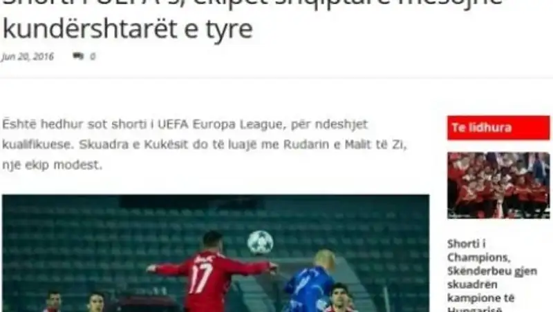 Албанская пресса по полной смакует пребывание своей сборной на ЕВРО-2016. Даже несмотря на то, что сборная Албании не сумела выйти в 1/8 финала и продолжить борьбу на чемпионате Европы, местные СМИ 9 из 10 материалов посвящают именно теме своей национальной команды. Сам факт попадания на ЕВРО-2016, достойная игра в матчах против Франции и Швейцарии, победа над Румынией, третье место в группе и надежда до последнего на выход в 1/8 финала, а также критика в адрес сборной Италии за проигранный матч ирландцам — вот это главные темы албанской спортивной прессы. На этом фоне новости о матчах первого раунда квалификации Лиги Европы выглядят, действительно, не так уж и примечательно. Поэтому нет ничего удивительного в том, что найти хоть какую-то обширную информацию в албанских СМИ о реакции на жеребьевку первого раунда пары «Кайрат» — «Теута» оказалось очень сложно. Албанские журналисты даже не посвятили своим представителям в Лиге Европы отдельных материалов, заголовков или фотографий. В основном, новость о будущих трех соперниках албанских клубов включает объединенную информацию, скомпонованную в один общий небольшой материал.
