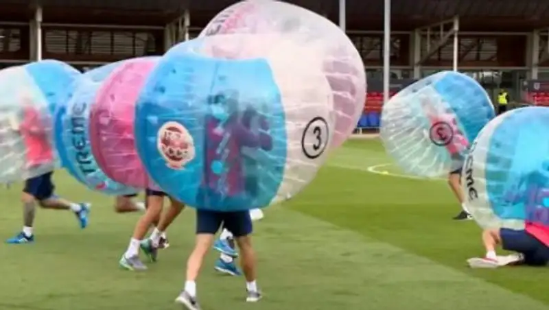 Игрокам было предложено поиграть в футбол в специальных шарах, однако поначалу им больше нравилось толкать друг друга, а форвард «Барселоны» Луис Суарес даже выпал из своего бампербола.