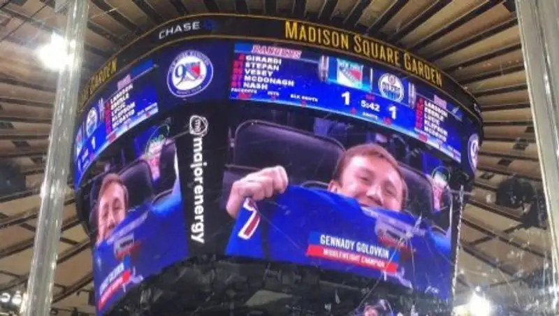 Казахстанский боксер Геннадий Головкин посетил матче Национальной хоккейной лиги между "Нью-Йорк Рейнджерс" и "Эдмонтон", сообщает Vesti.kz.