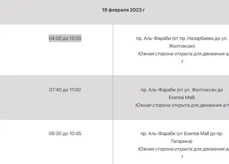 Движение на участке дороги по северной стороне пр. Аль-Фараби от пр. Назарбаева до ул. Желтоксан будет перекрыто с 04:00 до 12:00. Въезд в тоннель по пр. Аль-Фараби от ул. Мендикулова будет закрыт с 04:00 до 12:00 часов.