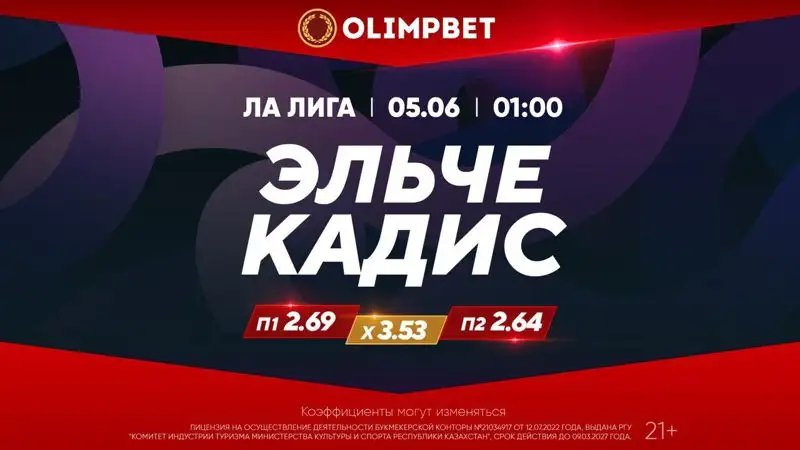 В линии букмекерской компании №1 Казахстана коэффициенты на исходы противостояния "Эльче" – "Кадис" представлены как: П1 – 2.69, Х – 3.53, П2 – 2.64.