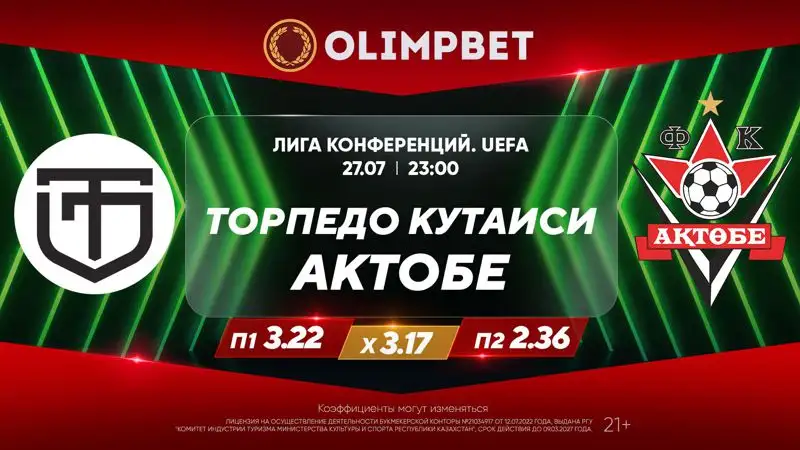 Тем не менее самый надежный букмекер страны считает, что у актюбинцев перспективы выйти в следующий раунд выше, чем у "Торпедо": проход "Торпедо" Кутаиси – 2.95, проход "Актобе" – 1.4. И даже в гостевом матче казахстанская команда, по мнению самого щедрого букмекера страны, смотрится фаворитом: П1 – 3.22, Х – 3.17, П2 – 2.36.