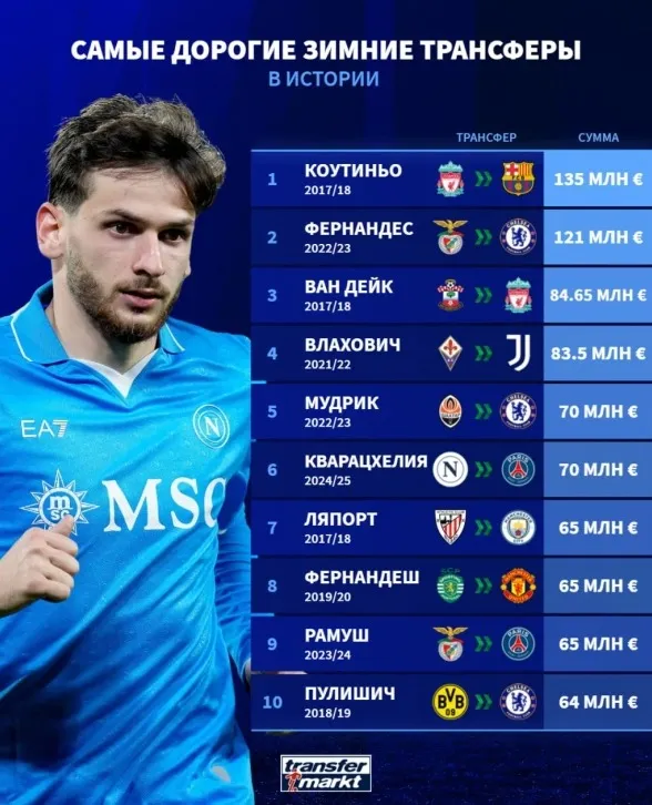 Хвича Кварацхелия вошел в топ-10 дорогих зимних трансферов в истории футбола
