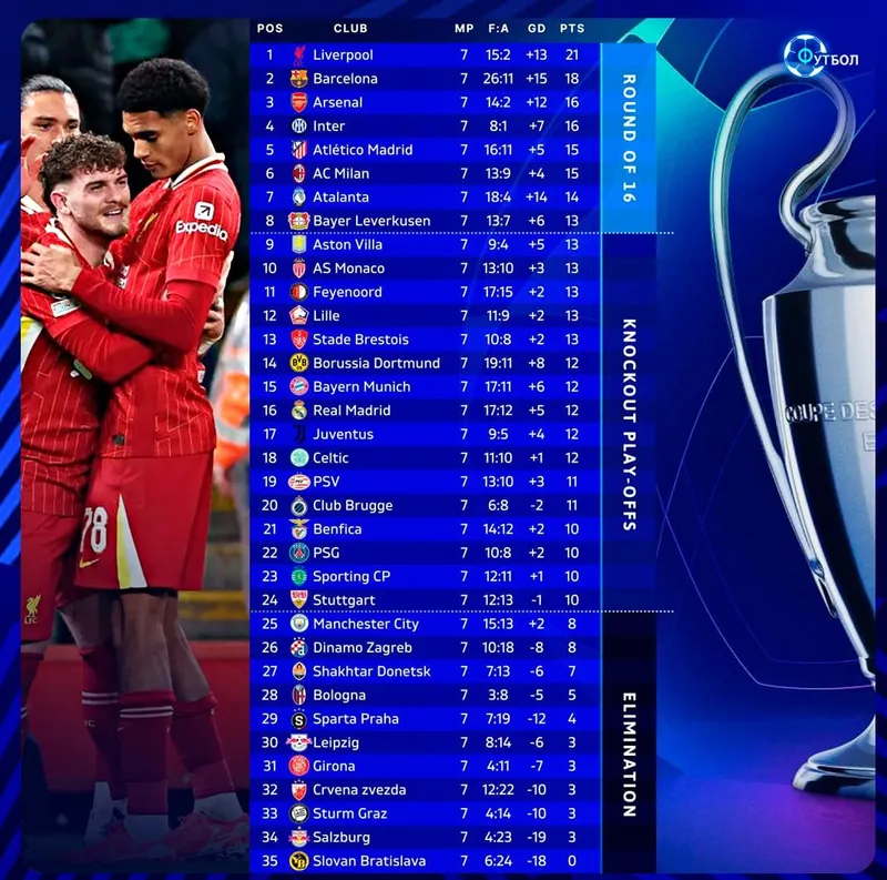 Турнирная таблица этапа лиги ЛЧ после седьмого тура.