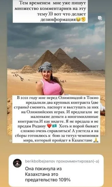 "В 2021 году мне перед Олимпиадой в Токио предлагали два крупных контракта (две страны) – сменить паспорт и выступать за них на Олимпийских играх. И предлагали немаленькие деньги, многомиллионные контракты. И, как видите, я не предала и не предам Родину", – написала она в Stories.