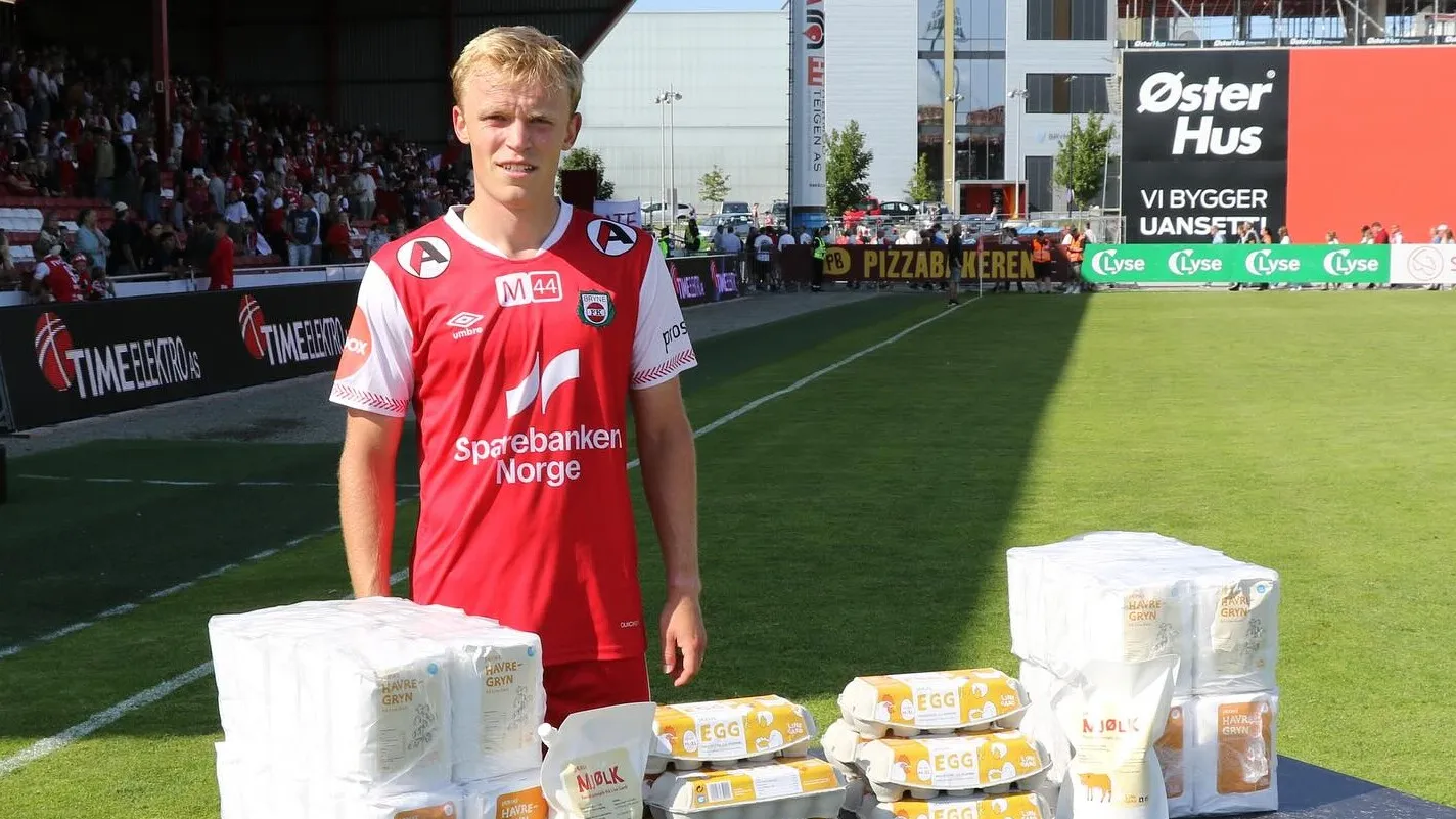 21-летний футболист был признан лучшим в матче с "Викингом". За свои достижения он был награжден 40 пакетами овсянки, 10 упаковками яиц, 20-ю литрами молока и большим столом, на котором был разложен весь его выигранный трофей.