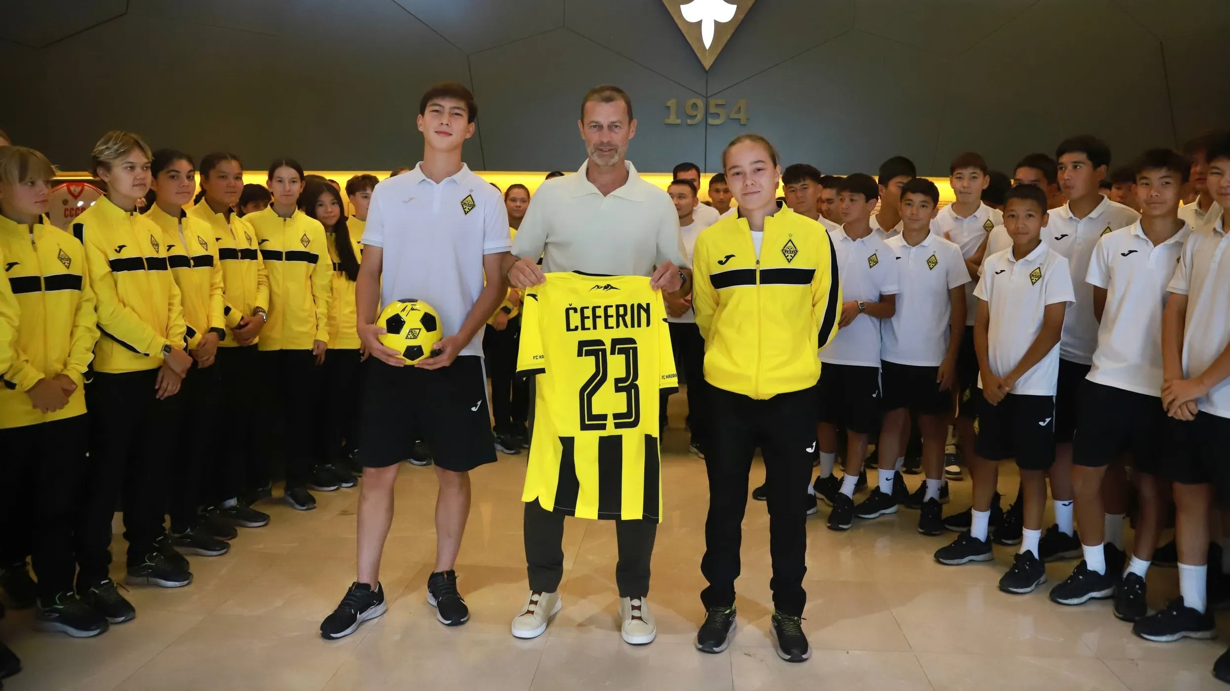 Молодые футболисты поприветствовали Чеферина на английском языке и вручили ему памятные подарки от клуба. Затем президент УЕФА побеседовал с тренерским штабом основной команды и "Кайрат-Жастар".