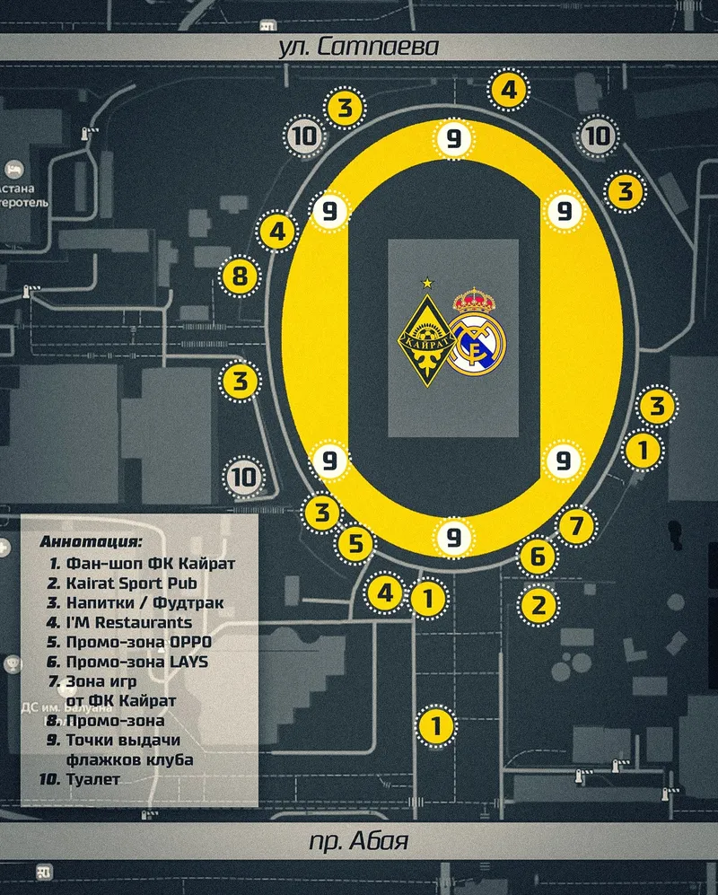 "Убедительно просим всех зрителей прибыть на стадион за 3-4 часа до начала матча, с учетом времени прохождения контроля (досмотра) при входе, а также во избежание очереди и столпотворения. Просим заранее подготовить свои билеты и паспортные данные. Начало матча – в 21:45. Раздели этот исторический момент вместе с нами!"Пресс-служба ФК "Кайрат"