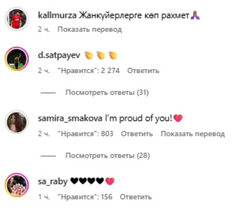 На публикацию одними из первых отреагировали Дастан Сатпаев (нападающий "Кайрата"), а также мама и девушка Калмурзы.