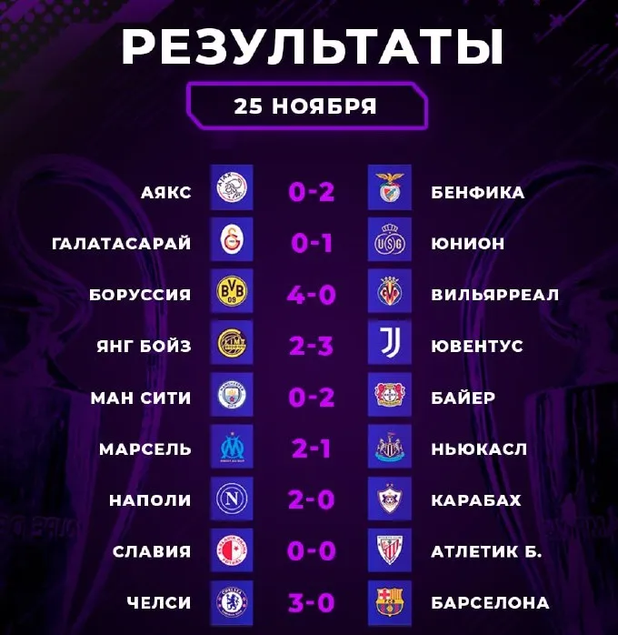 "Бенфика" обыграла "Аякс" со счетом 2:0, "Наполи" одержал победу над "Карабахом" со счетом 2:0, а "Боруссия" победила "Вильярреал", забив четыре мяча.