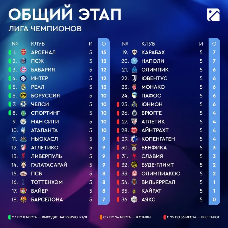 ПСЖ, "Бавария", "Интер" и "Реал" делят места со второго по пятое с равным количеством очков.