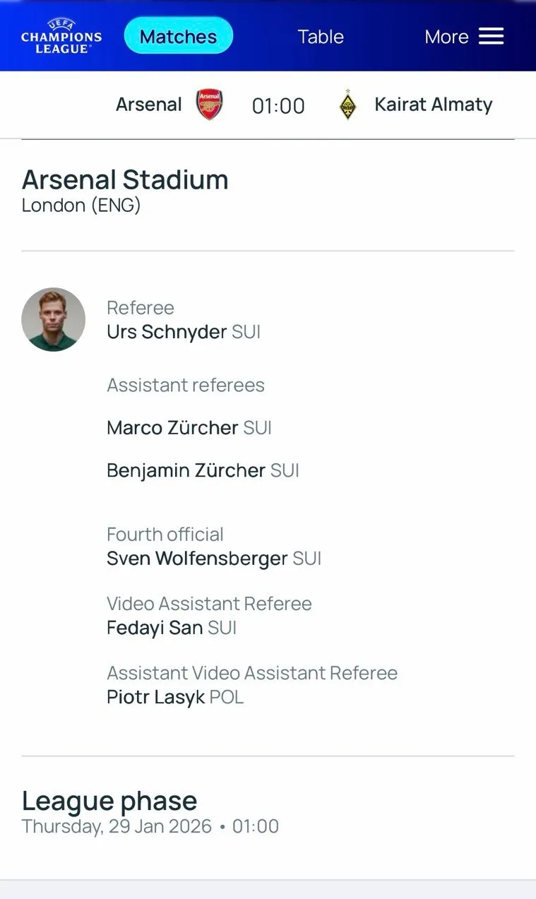 УЕФА назначил судей на матч восьмого тура общего этапа Лиги чемпионов "Арсенал" – "Кайрат", сообщает Zakon.kz.