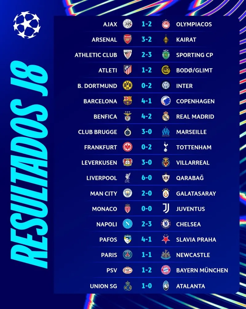 Итоговая таблица Лиги чемпионов после всех матчей представлена следующим образом: