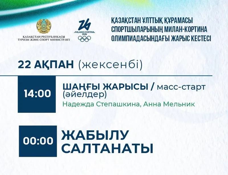 Лыжницы стартуют в 14:00 по казахстанскому времени, а в 00:00 состоится официальная церемония закрытия XXV зимних Олимпийских игр 2026 года. Об этом передает пресс-служба Министерства туризма и спорта Казахстана.