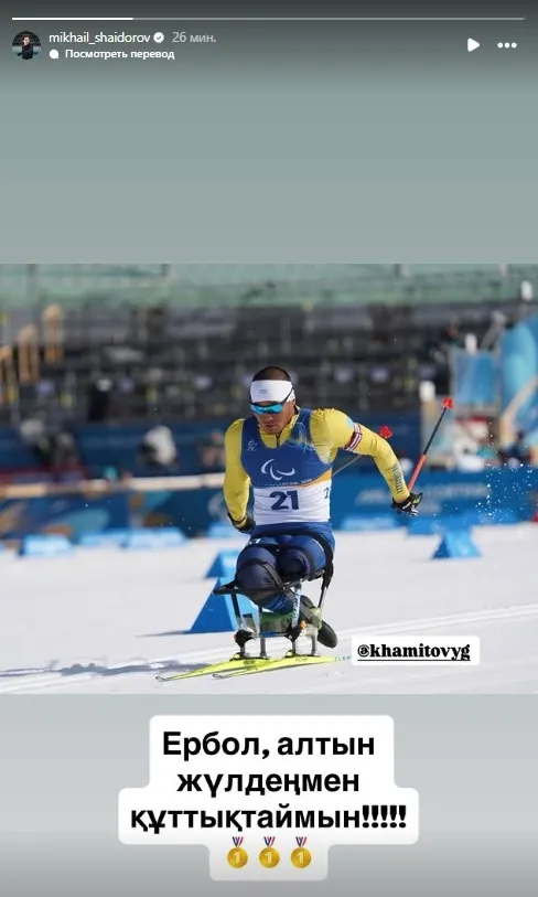 "Ербол, поздравляю с золотой медалью!" – написал Михаил в Instagram-Stories в пятницу.