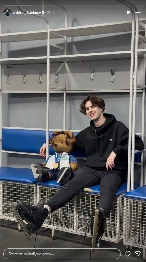 Об этом накануне, 1 апреля 2026 года, стало известно из Instagram-Stories олимпийского чемпиона. 21-летний спортсмен опубликовал фото, где мило позирует с игрушечным медвежонком.