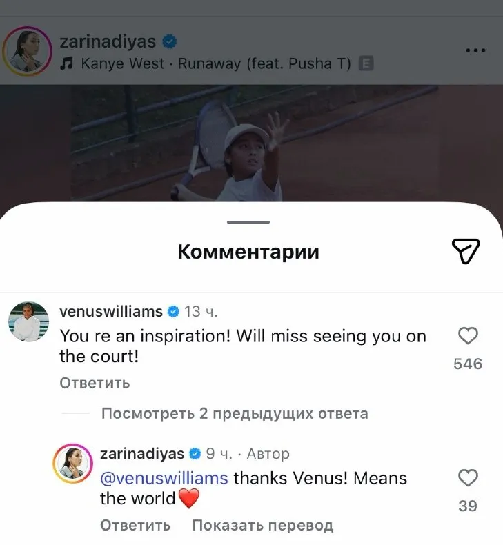 Но максимальное число лайков набрал комментарий 45-летней американской теннисистки, пятикратной победительницы Уимблдонского турнира Винус Уильямс. Важно отметить, что спортсменки ранее пересекались на турнирах WTA и в марте 2021 года Дияс одержала победу над титулованной американкой. Причем для этого казахстанке потребовалось всего два сета – 6:2, 7:6.