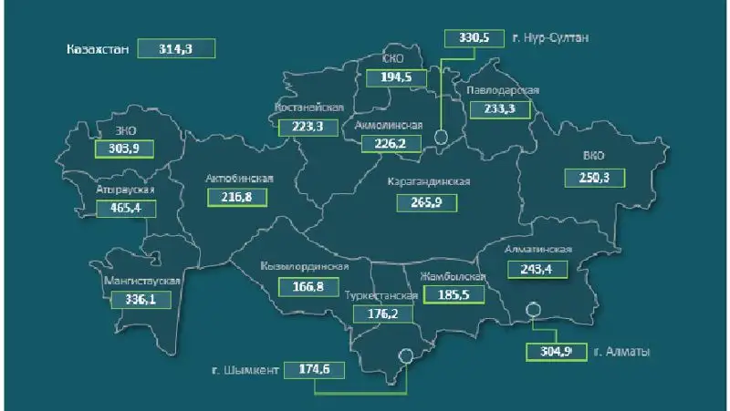 Наибольшую среднемесячную заработную плату получают работники Атырауской области: 465,4 тыс. тг, плюс 44,3%. Высокие зарплаты в секторе также у строителей Мангистауской области и столицы. Только в тройке лидирующих регионов заработная плата превышает среднюю по стране.