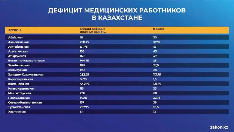 По официальным данным Минздрава, наибольший дефицит врачей отмечается в пяти регионах. Антилидером в этом списке является Костанайская область, где в медучреждениях не хватает порядка 441 штатной единицы. Затем идет Западно-Казахстанская – 283, Акмолинская – 259, Туркестанская – 258 и Мангистауская – 256.
