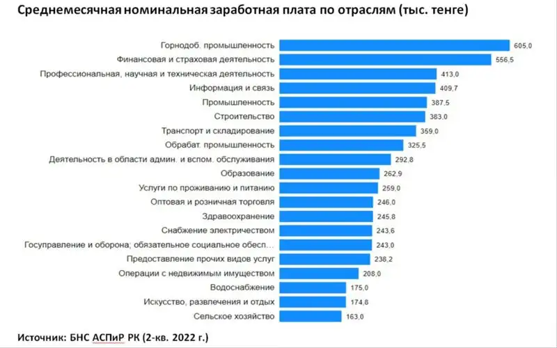 Уровень среднемесячной зарплаты в сельском хозяйстве самый низкий по сравнению с другими отраслями экономики – 163 тыс. тенге. Самая высокая среднемесячная зарплата у работников горнодобывающей отрасли – 605 тыс.