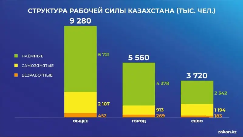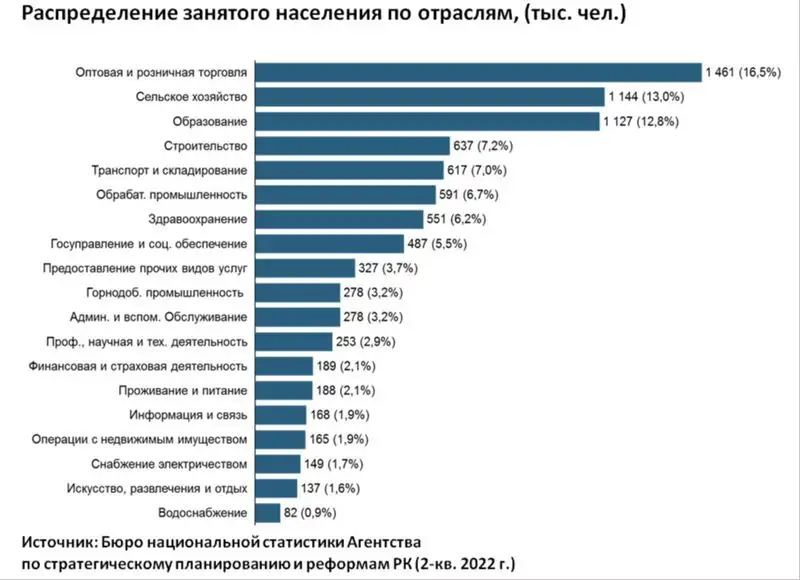 Согласно данным Бюро национальной статистики, больше всего казахстанцев трудится в сфере торговли – 1,6 млн человек, в сельском хозяйстве – 1,144 млн и образовании – 1,127 млн. Наименьшее число работников зафиксировано в сферах искусства, развлечения и отдыха – 137 тыс. и в водоснабжении – 82 тыс.