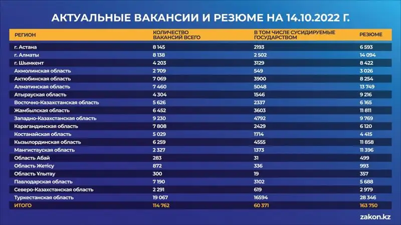 В сентябре нынешнего года на электронной бирже труда было размещено 115,6 тыс. вакансий и 82,3 тыс. резюме. При этом в Астане зафиксировано наибольшее число вакансий – 8145 и резюме – 6593, а наименьшее – в Абайской области – 283 и 499, соответственно.