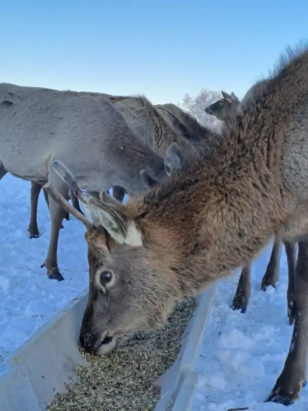 Кормят маралов грубыми кормами дважды в день. Им дают смеси из сена, овса, пшеницы, рапса, а также хвою, ветки сосны и соль.