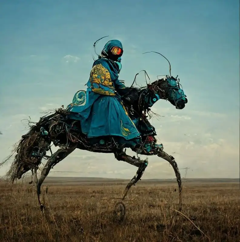 Так родилась одна из первых работ Ларисы Карчевской – антиутопичный Казахстан будущего. Нейросеть увидела все так же степной Казахстан. Однако казах в будущем стал наездником-киборгом и ехал он на голубой лошади-роботе. Голубой потому, что она резонирует с флагом Казахстана.