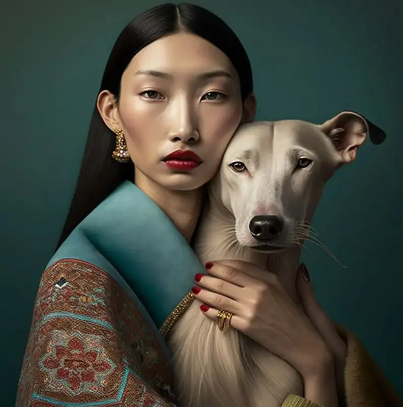 "В базе нейросети нет изображения такой породы как тазы. Я задавала нейросети референс борзой, миксовала с изображениями других собак, которых она знает. Результат превзошел мои ожидания. Получилась очень похожая на тазы собака. И теперь я надеюсь, что искусственный интеллект ее запомнит. Так как я дала ему это знание", – говорит художница.