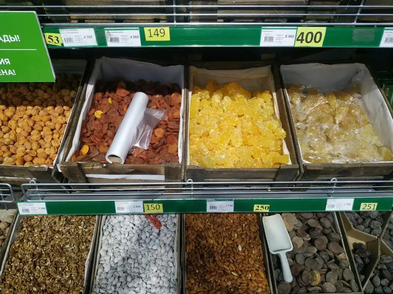 Сухофрукты, миндаль, орехи на шымкентских рынках и магазинах недешевы. Ведь основными поставщиками этого вида продуктов являются соседний Узбекистан, Таджикистан и Кавказ. Так, миндаль в сахаре на прилавках сетевого супермаркета стоит 3625 тенге за кг, орехи кешью – 7540 за кило, за килограмм неочищенного миндаля придется выложить 8740 тенге, а за килограмм фисташек – 7540 тенге. Очищенный фундук обойдется покупателю в шесть с половиной тысяч за кг, арахис – чуть более двух тысяч. Ядра очищенного грецкого ореха – шесть с половиной тысяч за килограмм.