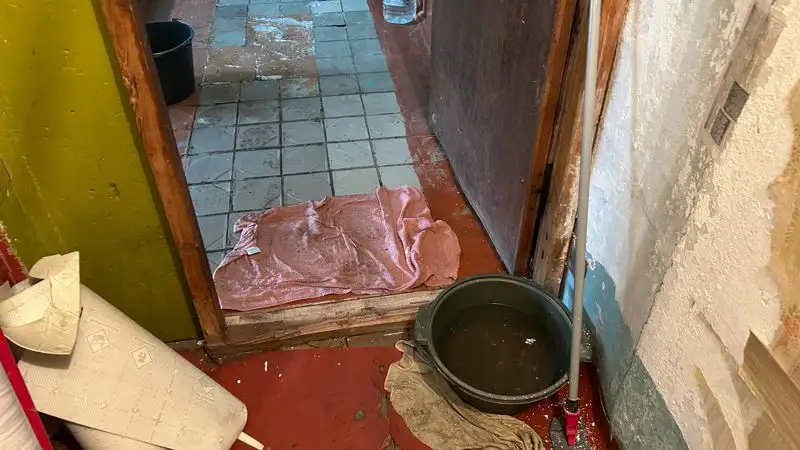 "Отсюда хлынула вода, поток прям лился. Мы все выскочили, собирали воду ведрами, тазами – спасались таким образом", – рассказывает жительница дома по ул. Алтынсарина, 262 Людмила Божко.