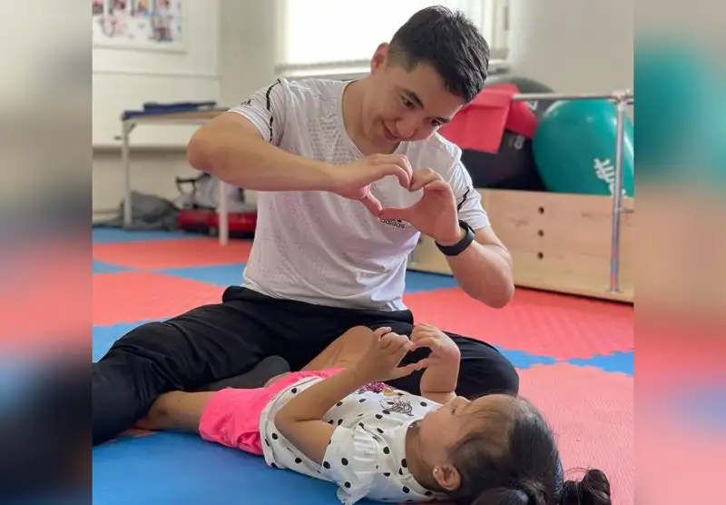 "В школьные годы я занимался джиу-джитсу и часто получал травмы. Последнее повреждение оказалось серьезным, я повредил коленную чашку и долгое время ходил на костылях. Боялся, что на всю жизнь останусь хромым. Чтобы не допустить этого, стал изучать медицину, стремился скорее восстановить функции ног. Так увлекся, что даже поступил в медицинский и проходил практику по ЛФК. Но традиционная методика лечения не совсем радовала меня. Тогда я стал искать иные формы. Исследовал, как занимаются с детьми за рубежом. Обучился в Москве и сейчас применяю эти техники".Специалист по реабилитации Данияр Болатов