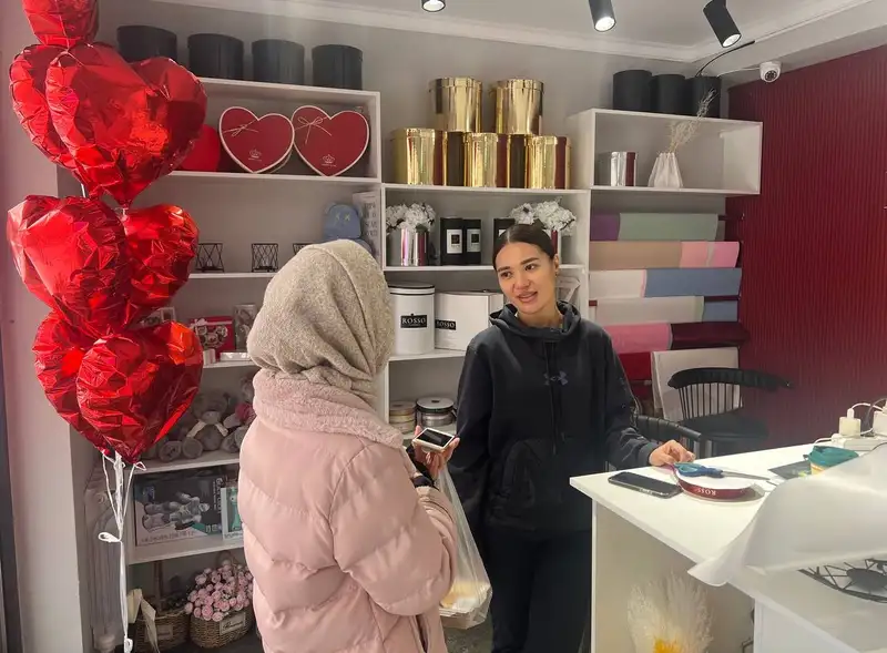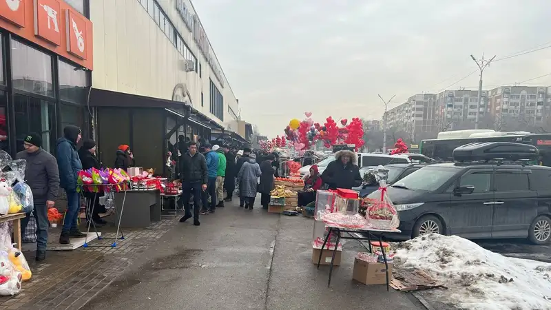 На алматинском рынке Тастак 14 февраля особенно многолюдно. Покупатели активно скупают цветы, шары, открытки-валентинки и сладости. Это традиционные подарки ко Дню святого Валентина.