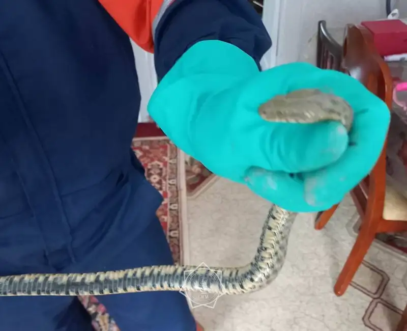 "Утром поступило сообщение о том, что в городе Абай в квартиру заползла змея. Выехали два спасателя. Зашли в квартиру, в детской спальной комнате обнаружили змею – серого ужа с черными пятнами. Поместили ее в изолированный контейнер. Отвезли на безопасное место и выпустили в степь", – уточнил главный спасатель Николай Гладченко.