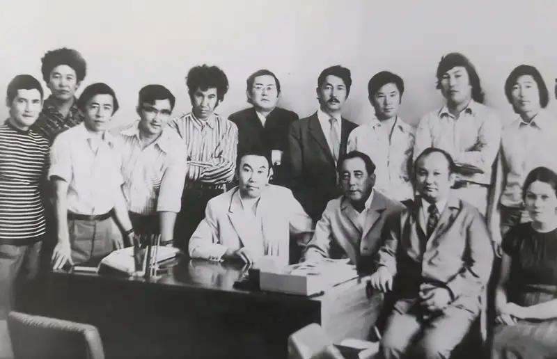 Слева направо: Марат Қабанбай, Кәрібай Ахметбеков, Ахат Жақсыбай, Сағат Әшімбаев, Шөмішбай Сариев, Софы Сматаев, Қажығали Мұхамбетқалиев, Рафаэль Ниязбеков, Оралхан Бөкей, Жарасқан Әбдіраш. Сидят слева направо: Шерхан Мұртаза, Ғафу Қайырбеков, Бекежан Тілегенов, техредактор Айман.