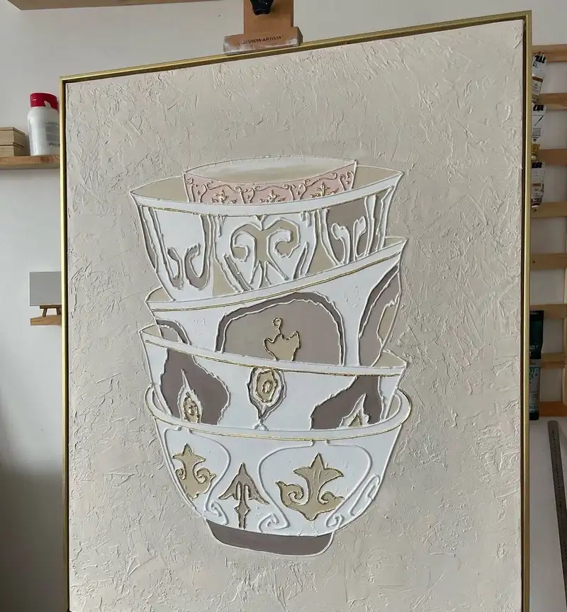 "В своих работах я хочу передать людям посыл казахской национальной идентичности. Оживить культурное наследие и привнести это в наш мир. Чтобы частица быта наших предков была в каждом доме, но в современной интерпретации. Например, в картинах я часто использую юрту, ее двери, а также шанырак. Различные украшения, тумары, орнаменты". Нагима Ибрашева