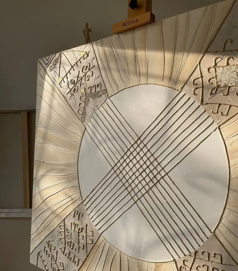 "Мне важно, чтобы смысл задумки картины передавался в каждой детали. Например, в картине "Шанырак" используются орнаменты, напоминающие тумар. То есть значение картины – не только семейная реликвия, продолжение рода, но и оберег".