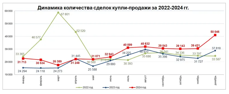В бюро также сообщили, что количество сделок купли-продажи жилья за декабрь 2024 года по сравнению с соответствующим месяцем прошлого года увеличилось на 32,3% (с 37 818 сделок на декабрь 2023 года).
