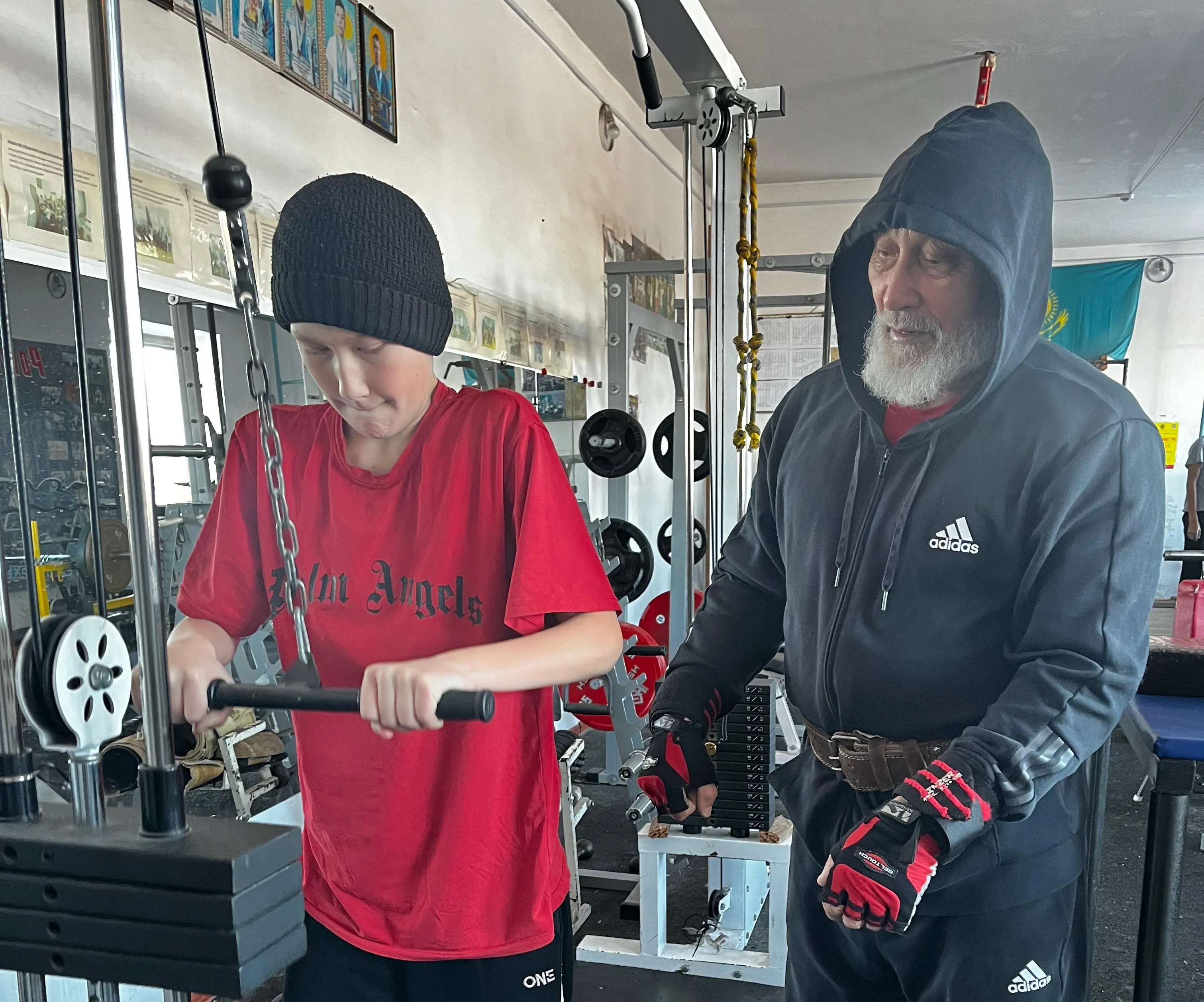 Секцию пауэрлифтинга Дарибай Оспанов ведет вместе со своим младшим сыном. Караман Абдулкарим – заслуженный тренер и мастер спорта РК по пауэрлифтингу и тоже является чемпионом мира. На сегодня в "качке", – так называют в поселке секцию Дарибая Оспанова, занимаются младшая, средняя и взрослая группы. В общей сложности 55 человек в возрасте от девяти до 23 лет. Тренировки проходят в небольшом помещении местного Дома культуры. Каждый уголок этого спортивного зала наполнен историей длиной в 20 лет. Именно столько пенсионер занимается пауэрлифтингом.