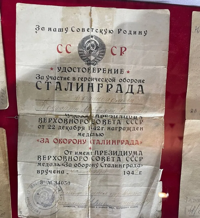 Под стеклом в центре зала – пожелтевшее от времени удостоверение красноармейца Митрофана Кружилина. В нем написано, что "указом Президиума Верховного Совета СССР от 22 декабря 1942 года его наградили медалью "За оборону Сталинграда".