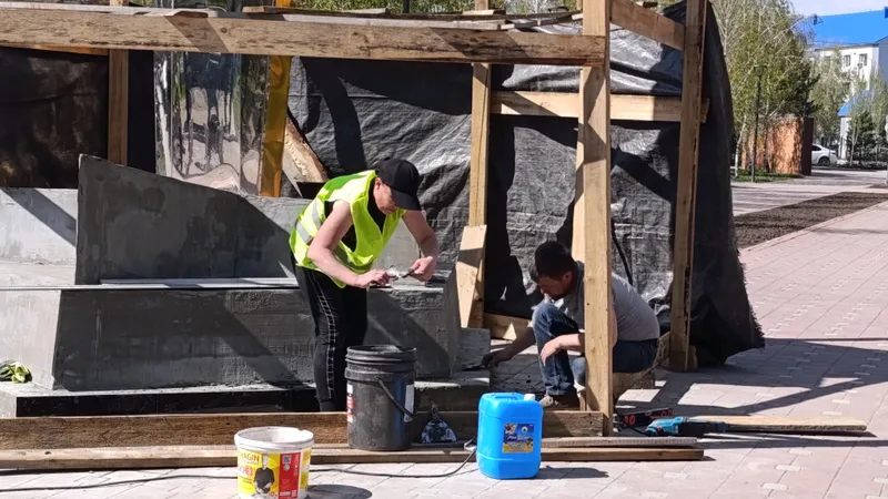 На одном из входов в парк костанайцев встречают гул дизельной электростанции, емкости с водой, мешки с цементом и специальное оборудование. А на памятнике 151-й отдельной стрелковой бригады специалисты ведут ремонтные работы.