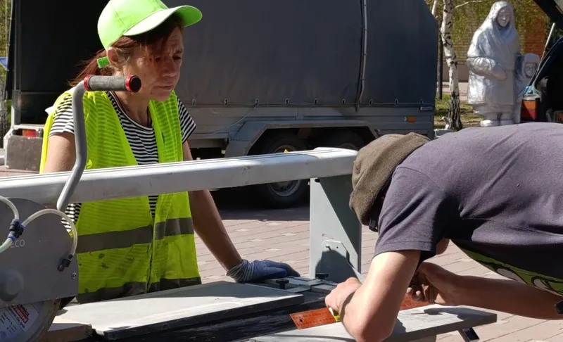 "Мы сначала выровняли поверхность бетонного основания, провели шлифовку. Сейчас делаем облицовку. На специальном станке режем плиты, чтобы было ровно и четко. Работа ответственная. После установки всех плит еще предстоит гравировка букв. Хочется сделать все качественно", – рассказал специалист.