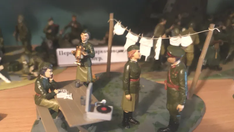 Есть и застывшие, но узнаваемые кадры из любимых фильмов: лейтенанта "Кузнечика" отчитывает и отстраняет от полетов командир ("В бой идут одни старики"), а старшина Федот Васков из картины "А зори здесь тихие" серьезно беседует с девушками из взвода зенитчиц.